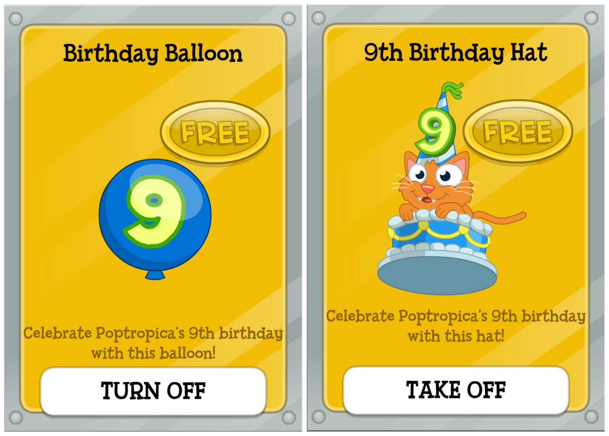 Poptropica is officially 9 years old! I always though that it had been around for more than 9 years but I guess not. They celebrated with an amazing cake and are giving out a free balloon and birthday hat in the store. These items are only available until October.